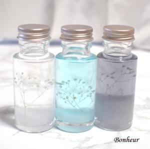 円柱瓶でカスミソウ入りのストームグラスです。左から、透明のまま、薄い青色、薄い紫色で色付けしたものとなります。