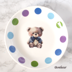丸皿でクマさんとドット転写紙を選ぶと、こんな感じに仕上がりますよ。